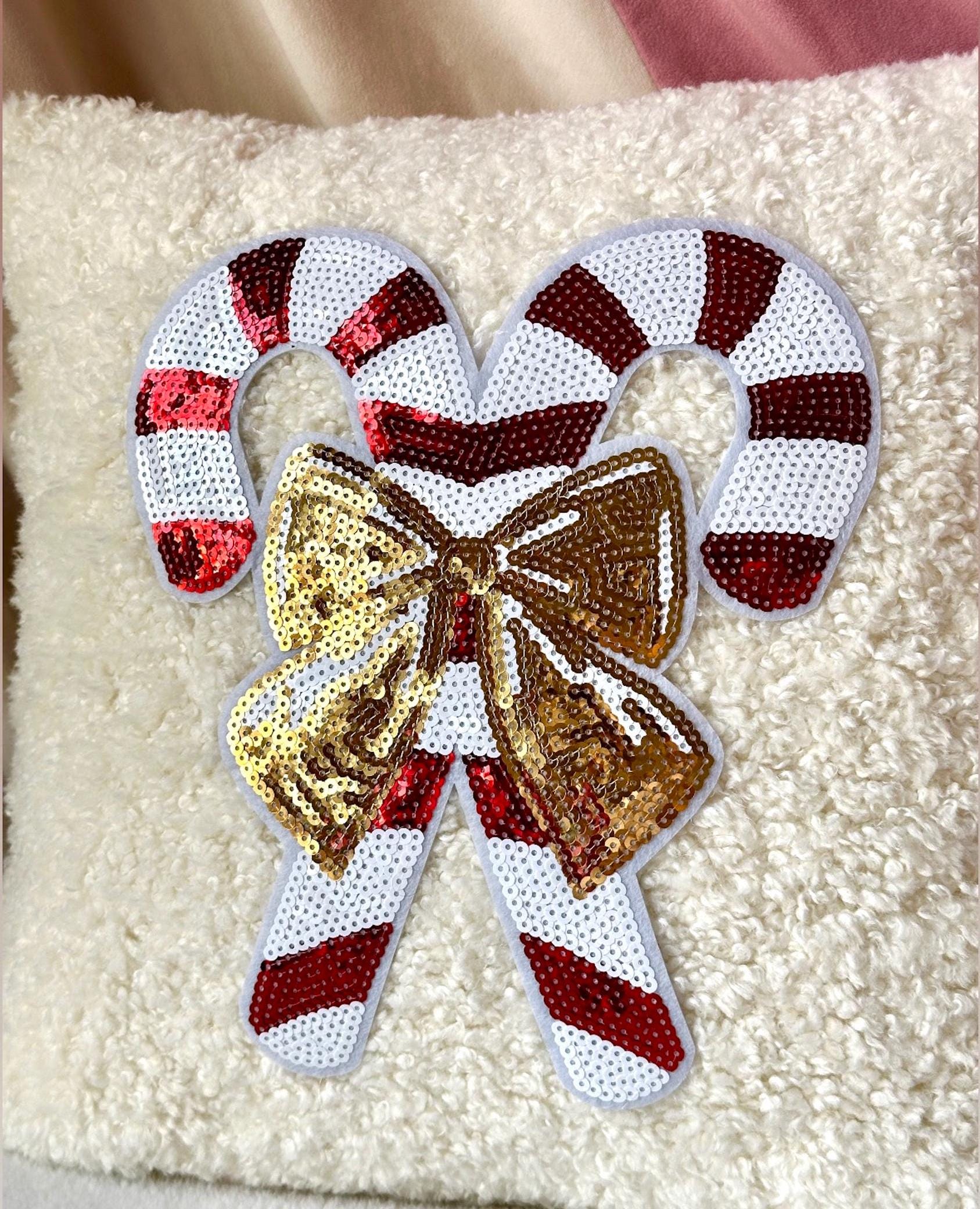 Candy Cane Christmas Pillow, White Boucle Pillow, Gold Bow Pillow, Sequin Christmas Pillow, Coquette Christmas Pillow, Cozy Decor Home