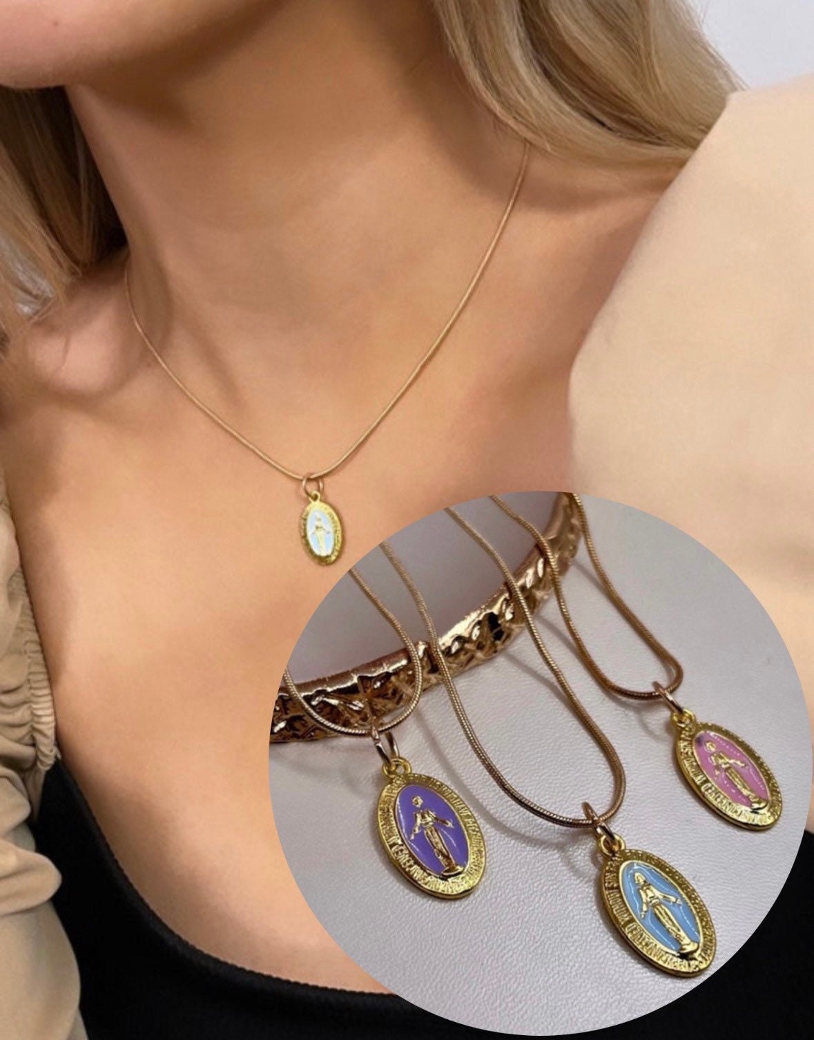 Made of enamel and 18K gold, my unique gold plated Virgin Mary catholic necklace is the perfect compliment to any outfit idea, whether it's your big day or a special celebration for a loved one!
