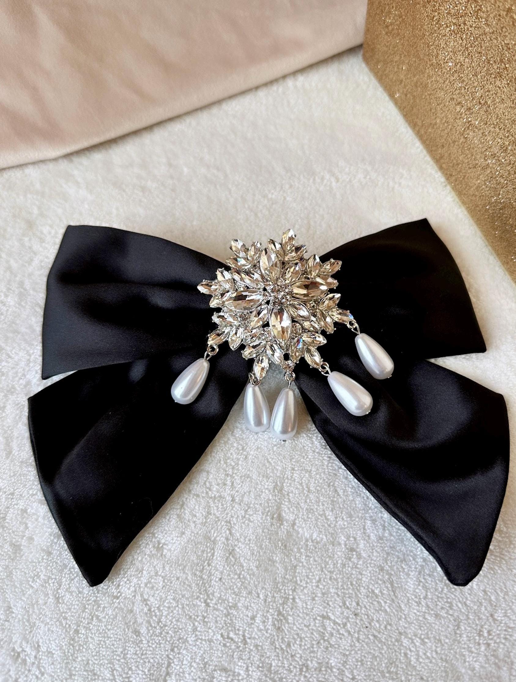 Made with regal satin and embellished with a dazzling vintage rhinestone snowflake and faux pearls, my black satin hair bow clip is a unique present for all the coquettes in your life. You can't go wrong when gifting my embellished and festive hair bow this Christmas!