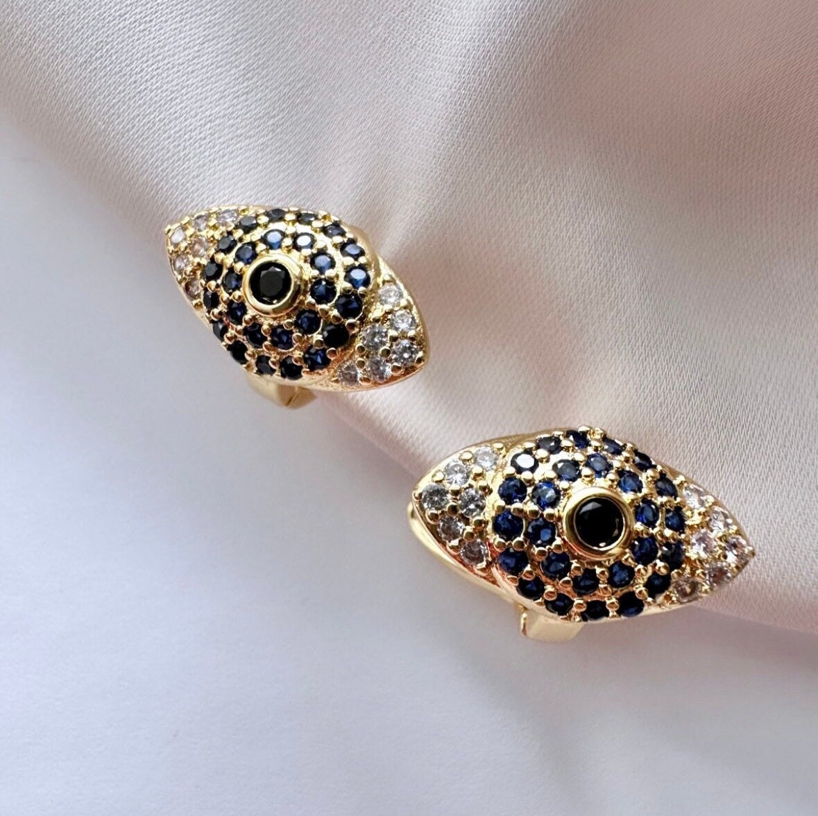 Are you looking for the perfect pair of all CZ evil eye earrings for someone special this gifting season? Or unique gold evil eye stud earrings to spoil yourself? Made with dazzling cubic zirconia micro pavé, tarnish-resistant stainless steel and plated with 14K gold, my statement evil eye earrings are the perfect complement to any outfit idea! My unique Nazar stud earrings are a great gift idea for any special occasion to all the women in your life. You can't go wrong when gifting my evil eye studs to your bestie, wife or sister! DETAILS - PLEASE READ CAREFULLY: My Turkish studs are entirely handmade, using the finest materials, and my best skill set. These gold and blue cz evil eye earrings are: -comfortable to wear -safe for sensitive skin -approximately 0.6'' in length -tarnish free -a cute gift idea for Mother's day! -made in Montreal, Canada Here is a matching ring to go perfectly with your delicate cz stud earrings: https://www.etsy.com/ca/listing/1263468678/starburst-ring-gold-signet-ring?click_key=0928a5ee7764d60d2e586170d28804fc8976ddd7%3A1263468678&click_sum=aeba8f52&ref=shop_home_active_8&frs=1 DIRECTIONS: Please keep your evil eye protection earrings away from water, oils/creams. TRACKING: Please see shipping notification for tracking info. PROCESSING/SHIPPING/RETURN/REFUND: -Your evil eye earrings will be dispatched within 2-4 business days. -All orders of 75$+ will receive a gift with their purchase! -Returns/exchanges are not accepted due to hygiene reasons, please contact me if you have any problems with your order!