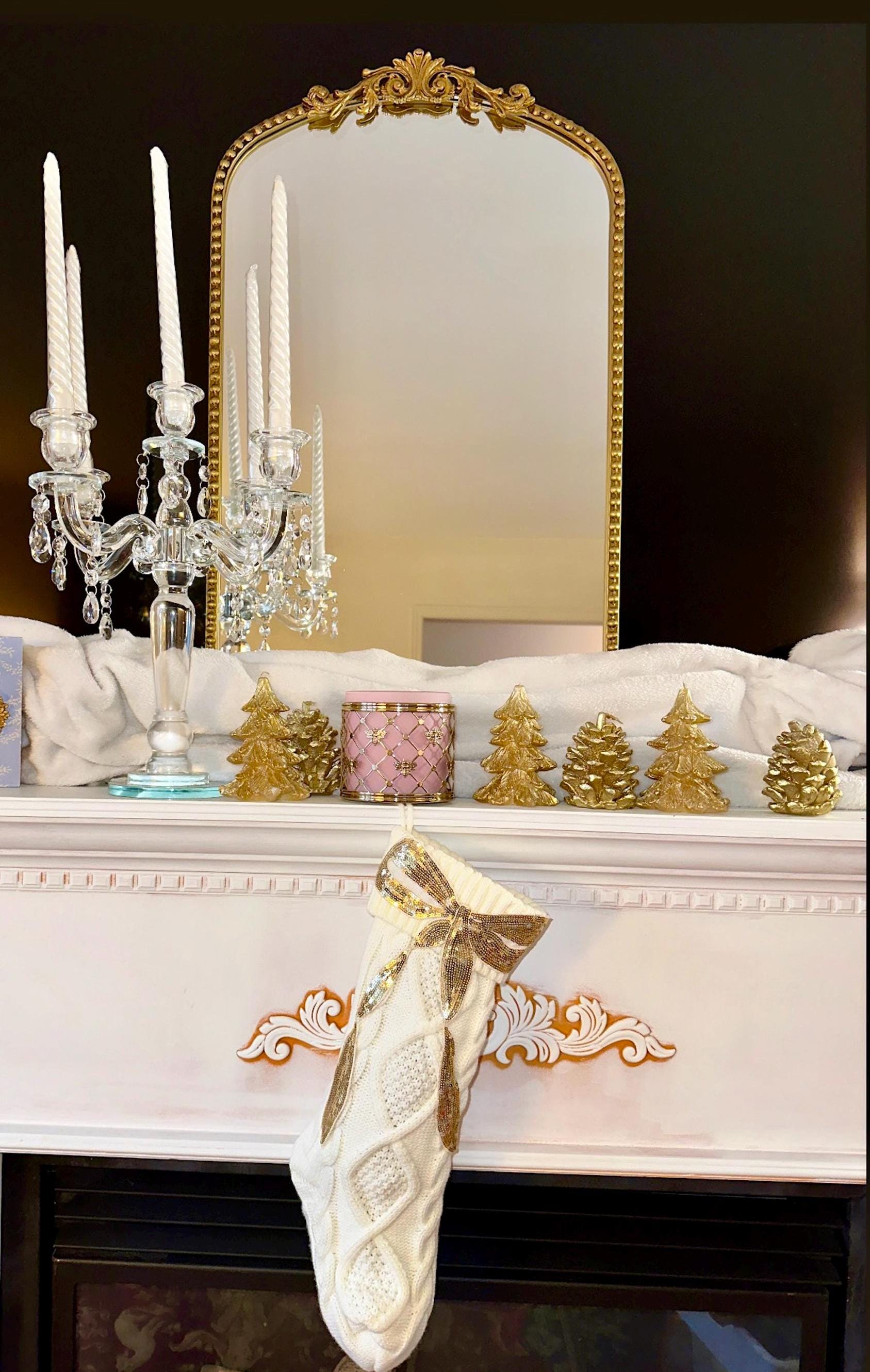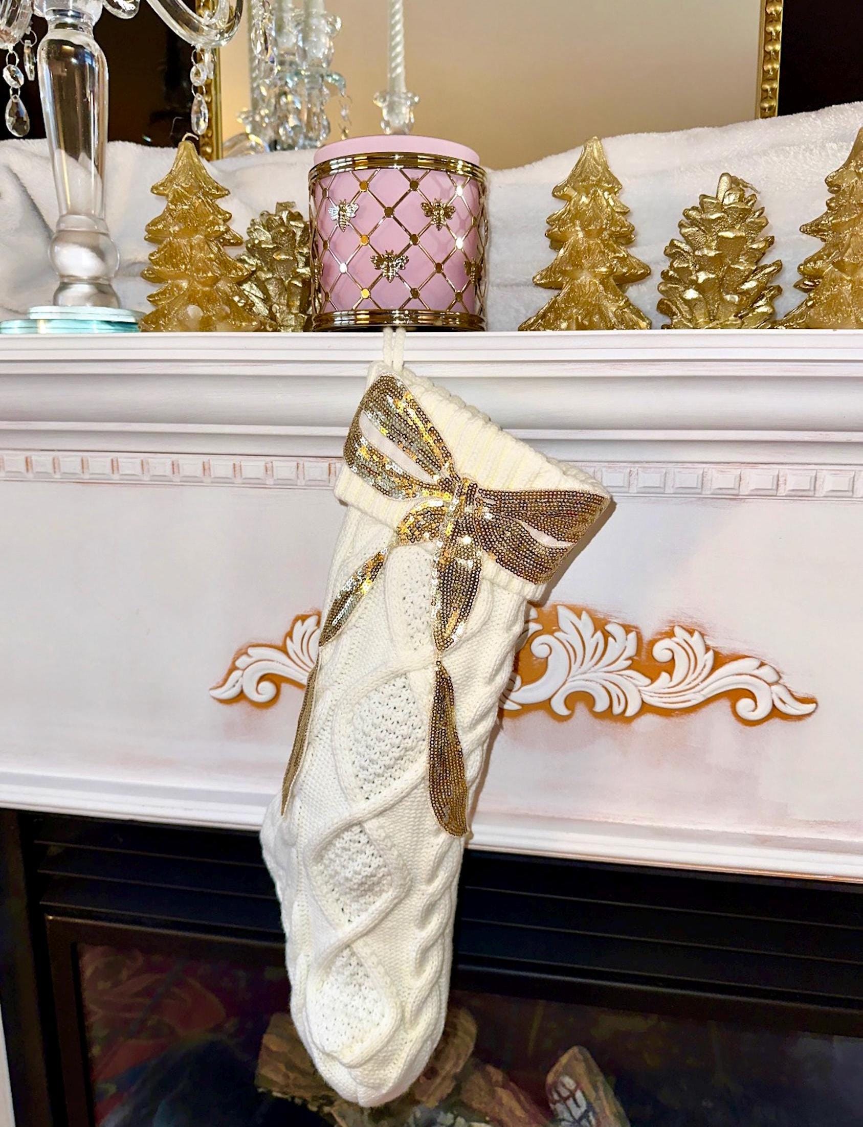 Made with soft yarn and dazzling gold sequin bows, my white and red sequin Christmas stocking is the perfect complement to your living room! These sparkly coquette Christmas stockings are a great gift idea for any special occasion to all the women in your life. You can't go wrong when gifting my cute gold bow Christmas stocking!