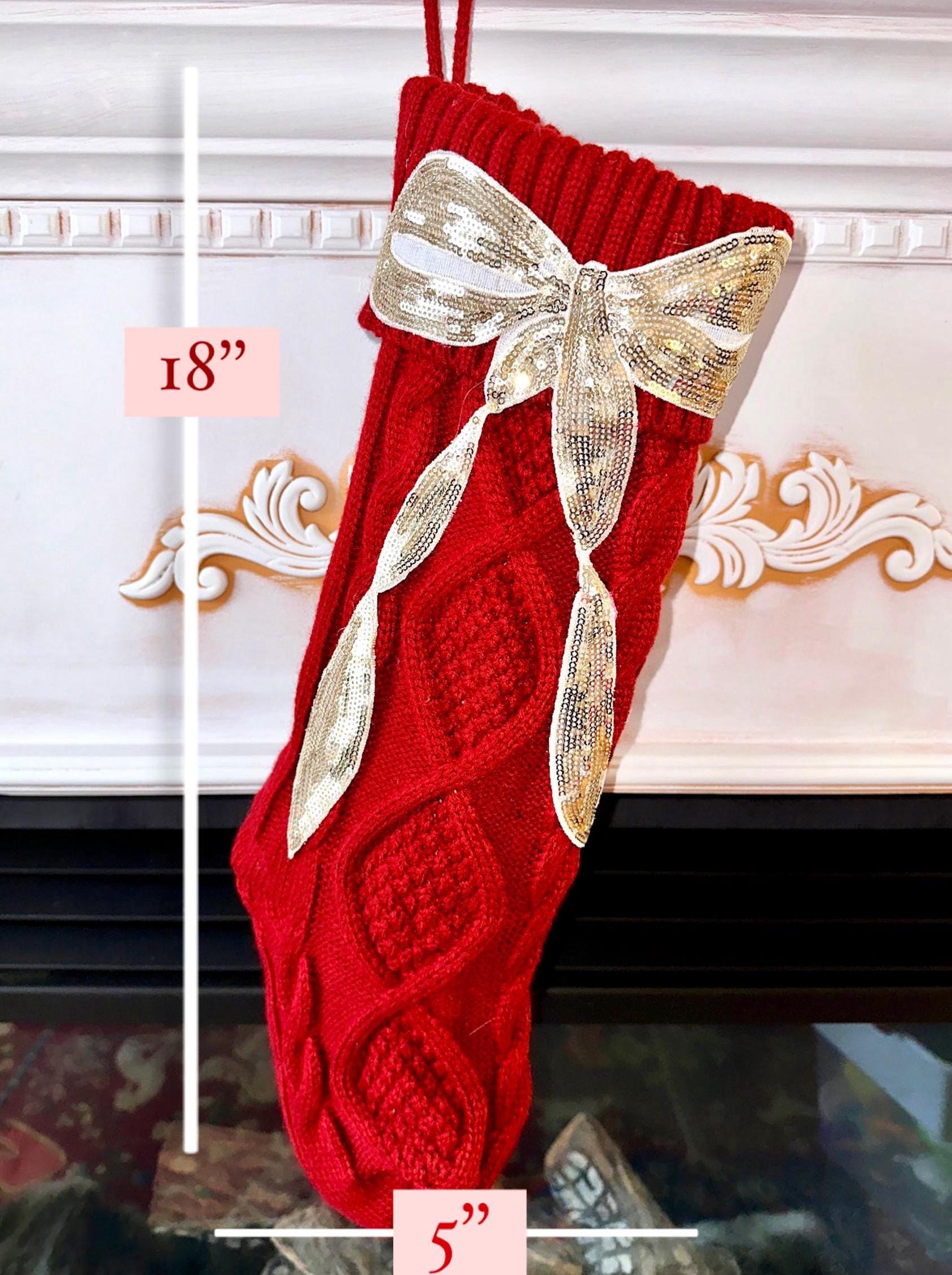 Red Knit Christmas Stocking, Bow Christmas Stocking, Coquette Christmas Stocking, Sequin Christmas Stocking, Gold Bow Christmas Decoration