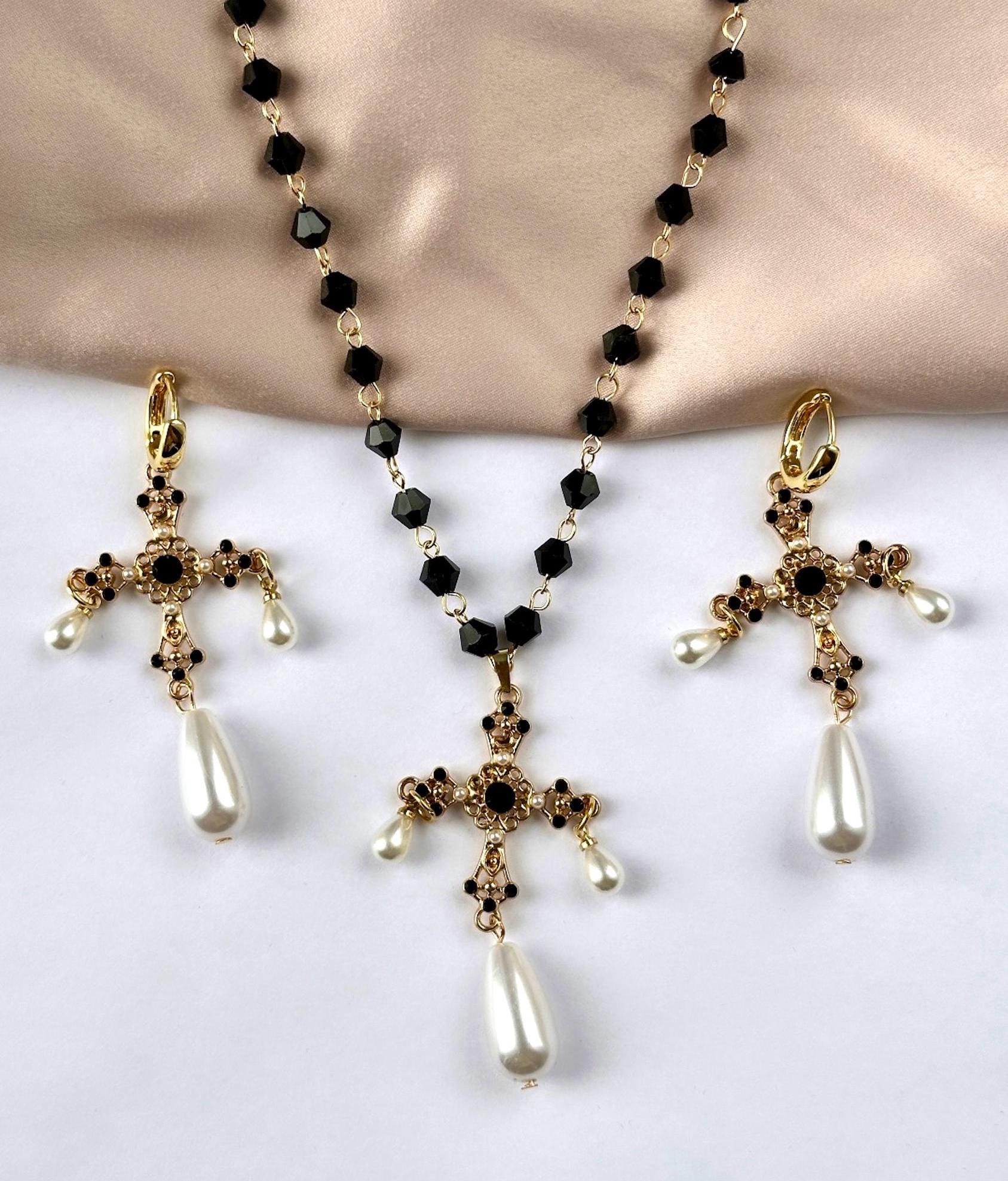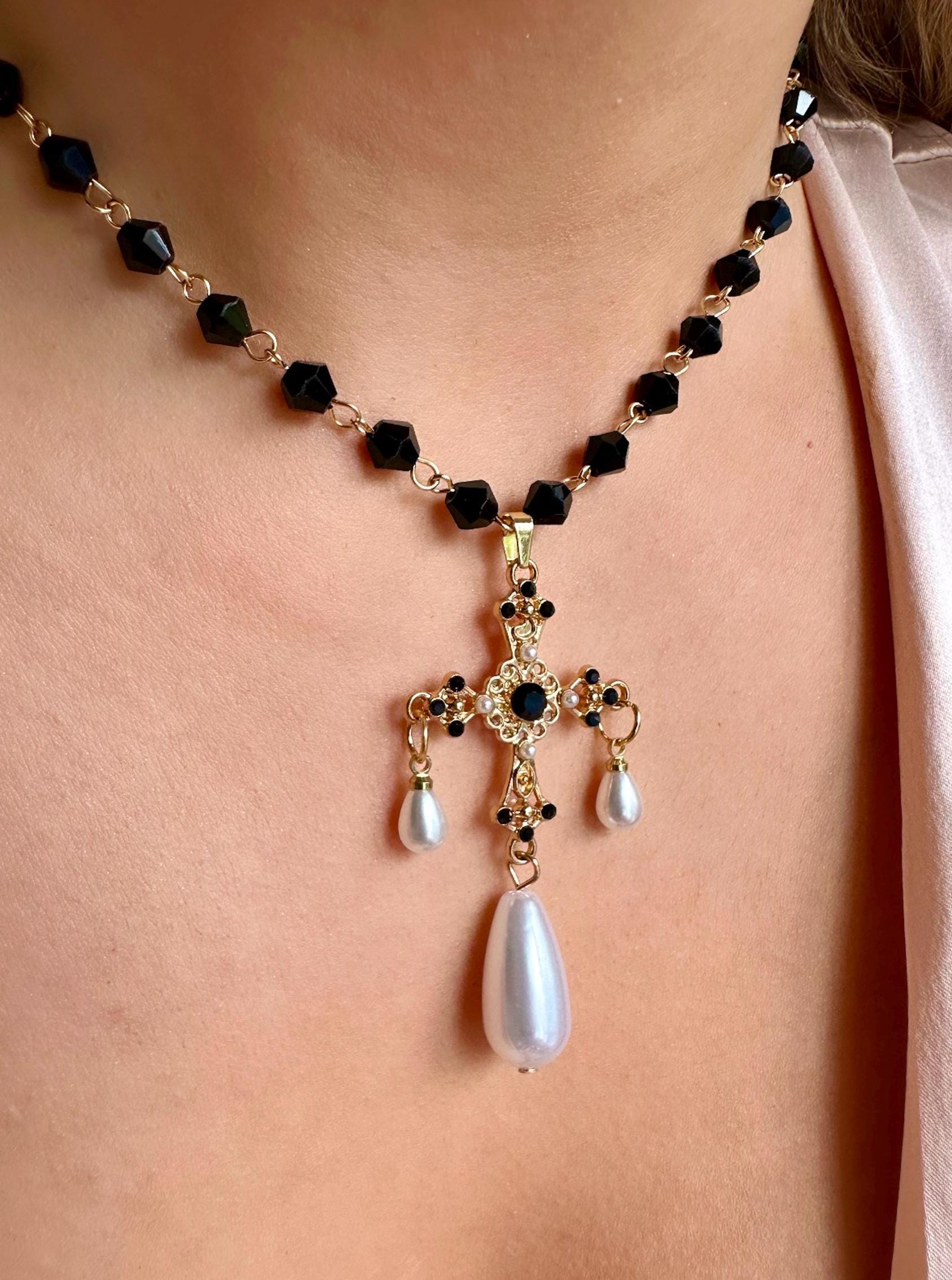 Renaissance Cross Necklace, Tudor Cross Necklace, Medieval Cross Necklace, Goth Cross Necklace, Pearl Cross Necklace, Halloween Necklace
