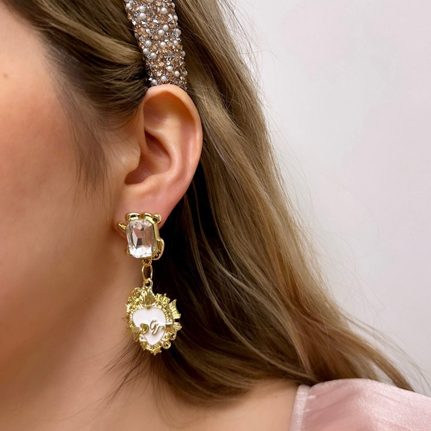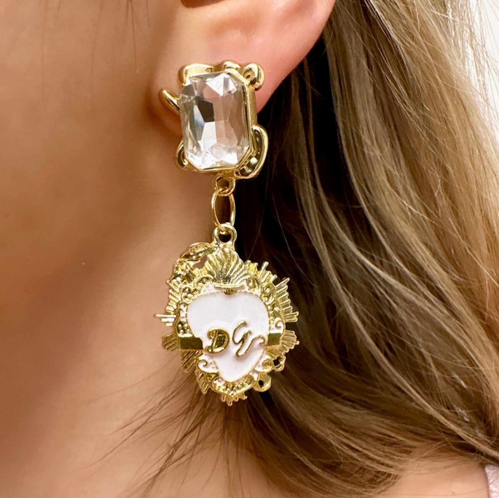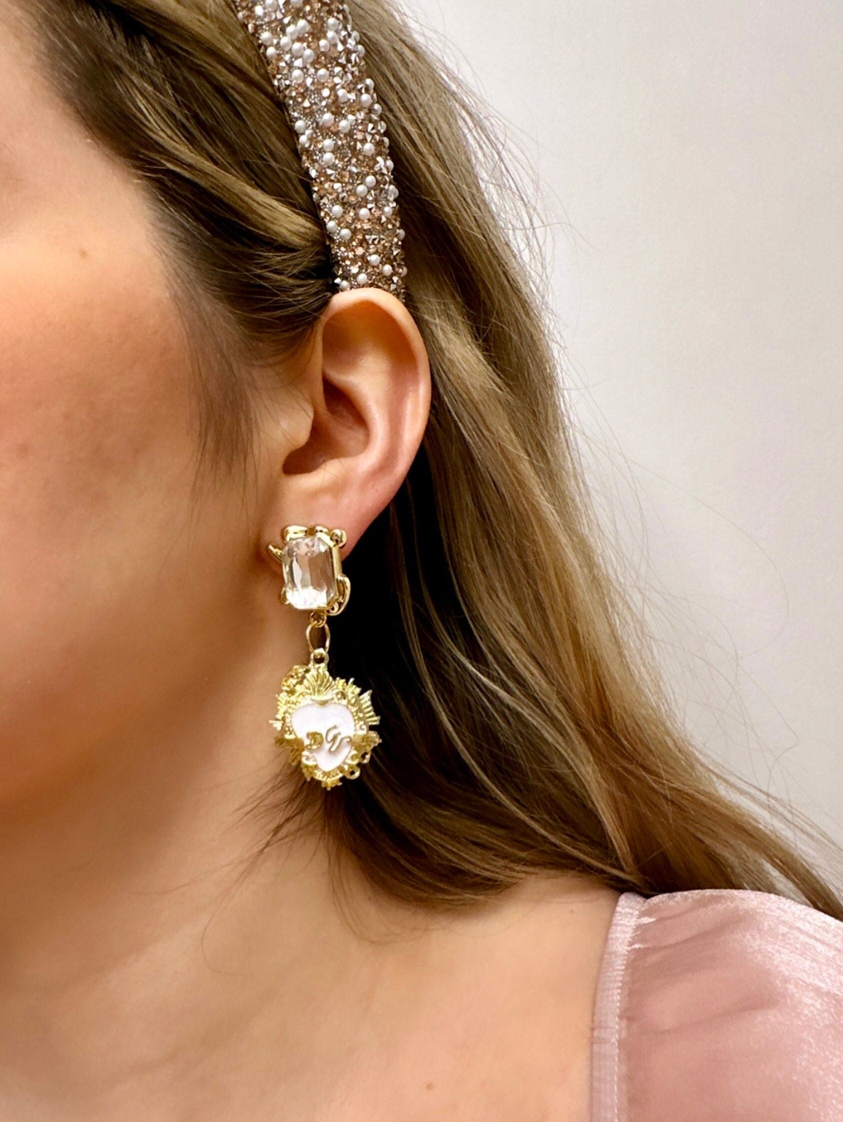Made with dazzling rhinestones and enamel sacred heart charms, my vintage-style enamel sacred heart earrings are the perfect complement to any outfit idea! My coquette-inspired white heart earrings are a great gift idea for any special occasion to all the women in your life. You can't go wrong when gifting my milagro earrings to your bestie, wife or girlfriend!