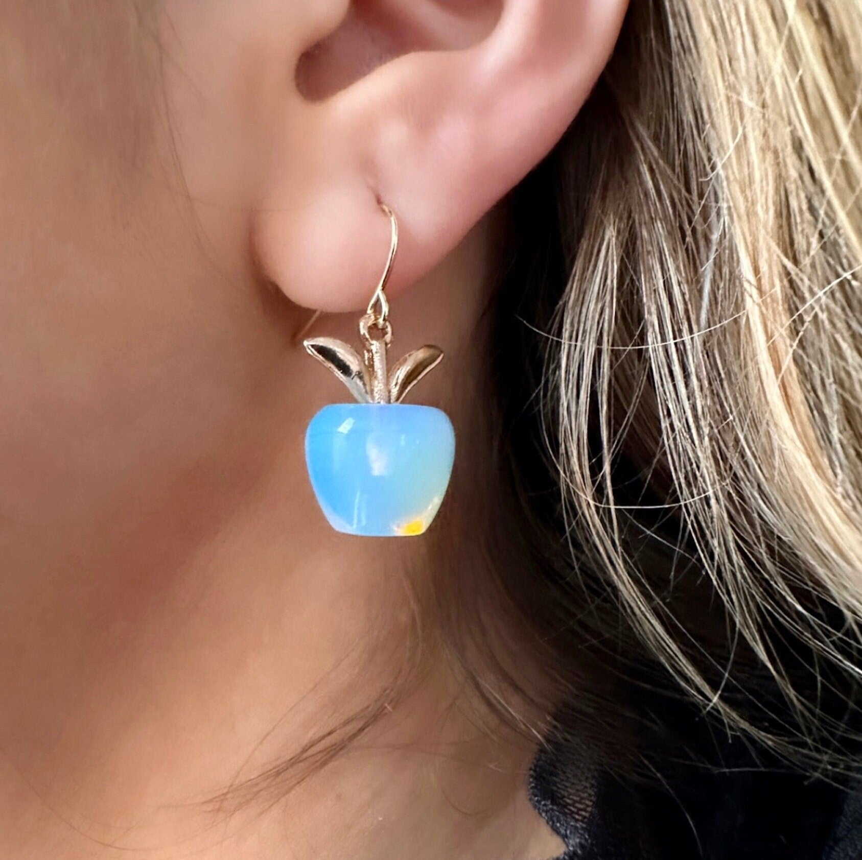 Teacher Earrings, Gold Apple Earrings, Apple Teacher Gift, Apple Jewelry, Moonstone Dangle Earrings, End Of Year Teacher Gift, Fruit Earring