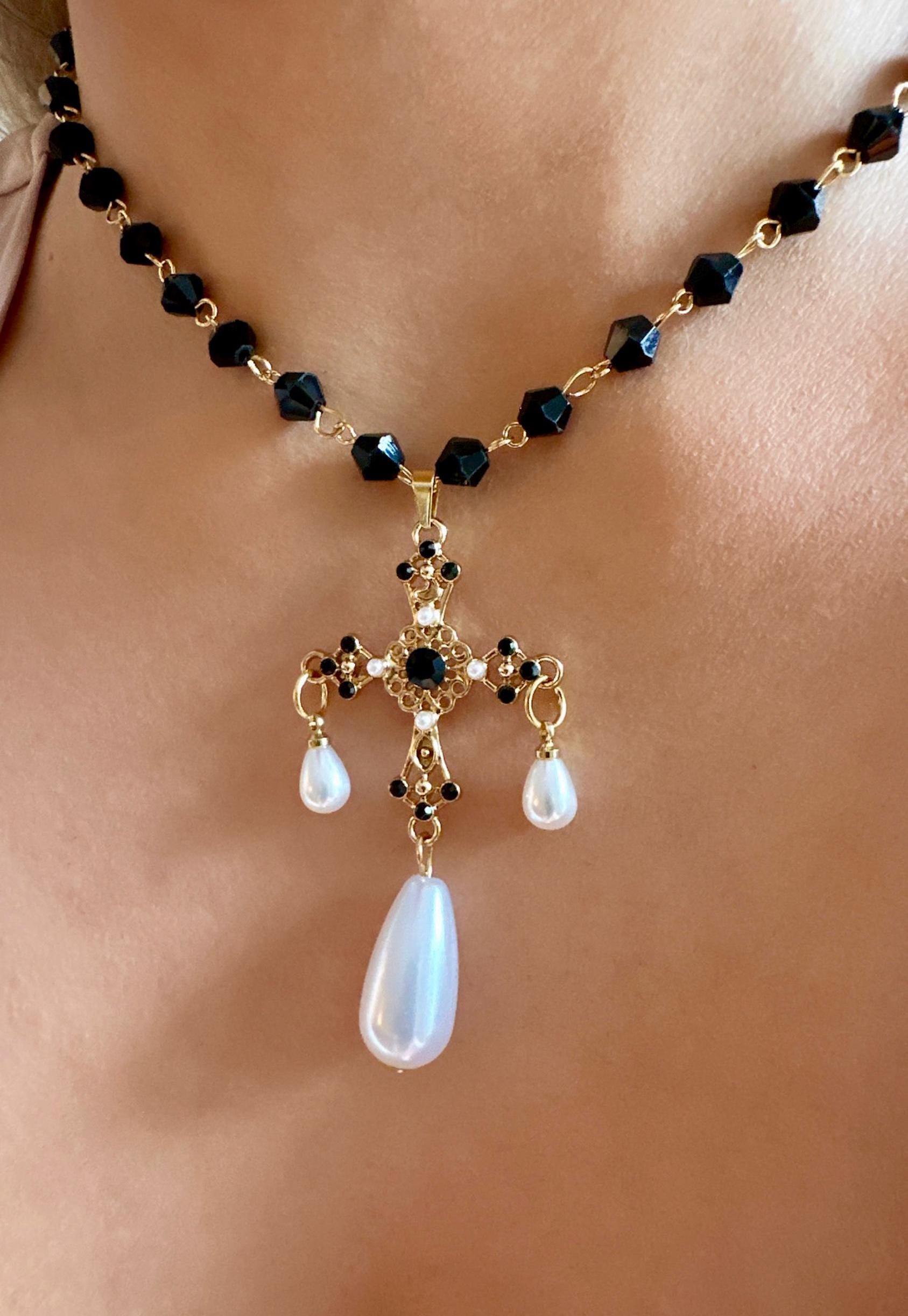 Tudor Cross Necklace, Renaissance Cross Necklace, Medieval Cross Necklace, Goth Cross Necklace, Pearl Cross Necklace, Halloween Necklace