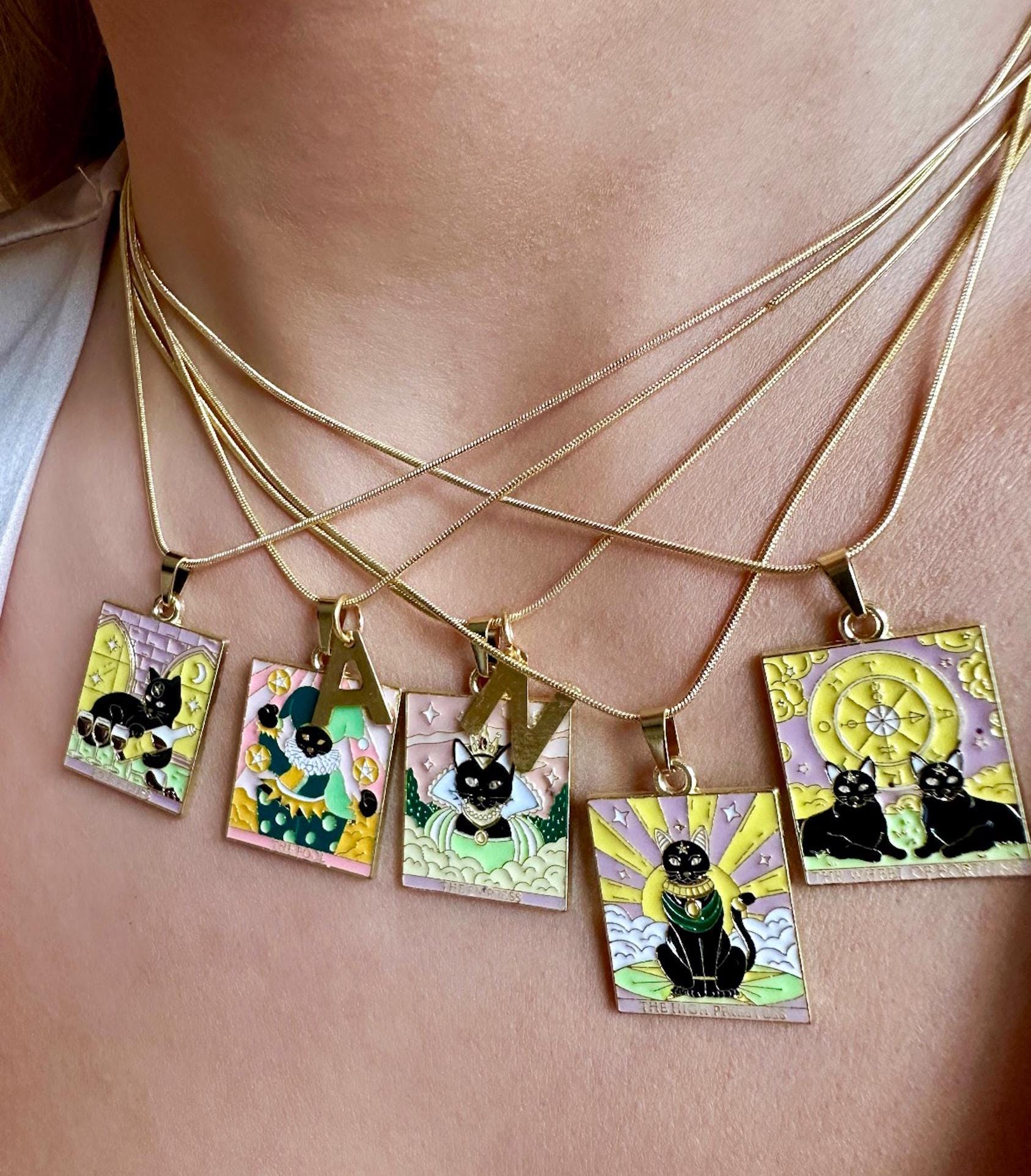 Wheel Of Fortune Necklace, Cat Tarot Necklace, Black Cat Necklace, Halloween Cat Necklace, Wheel Of Fortune Tarot, Tarot Card Necklace, Set